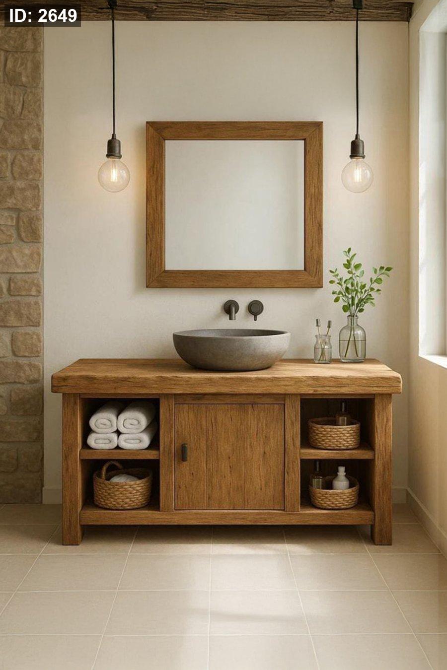 مغسلة خشب ريفية بحوض حجر مع تخزين جانبي