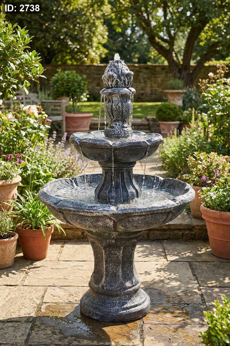 نافورة طبقتين بتصميم كلاسيكي ولون رمادي رخامي، شلالات خفيفة وصوت مي مريح… بتعطي فخامة لأي حديقة أو مدخل.