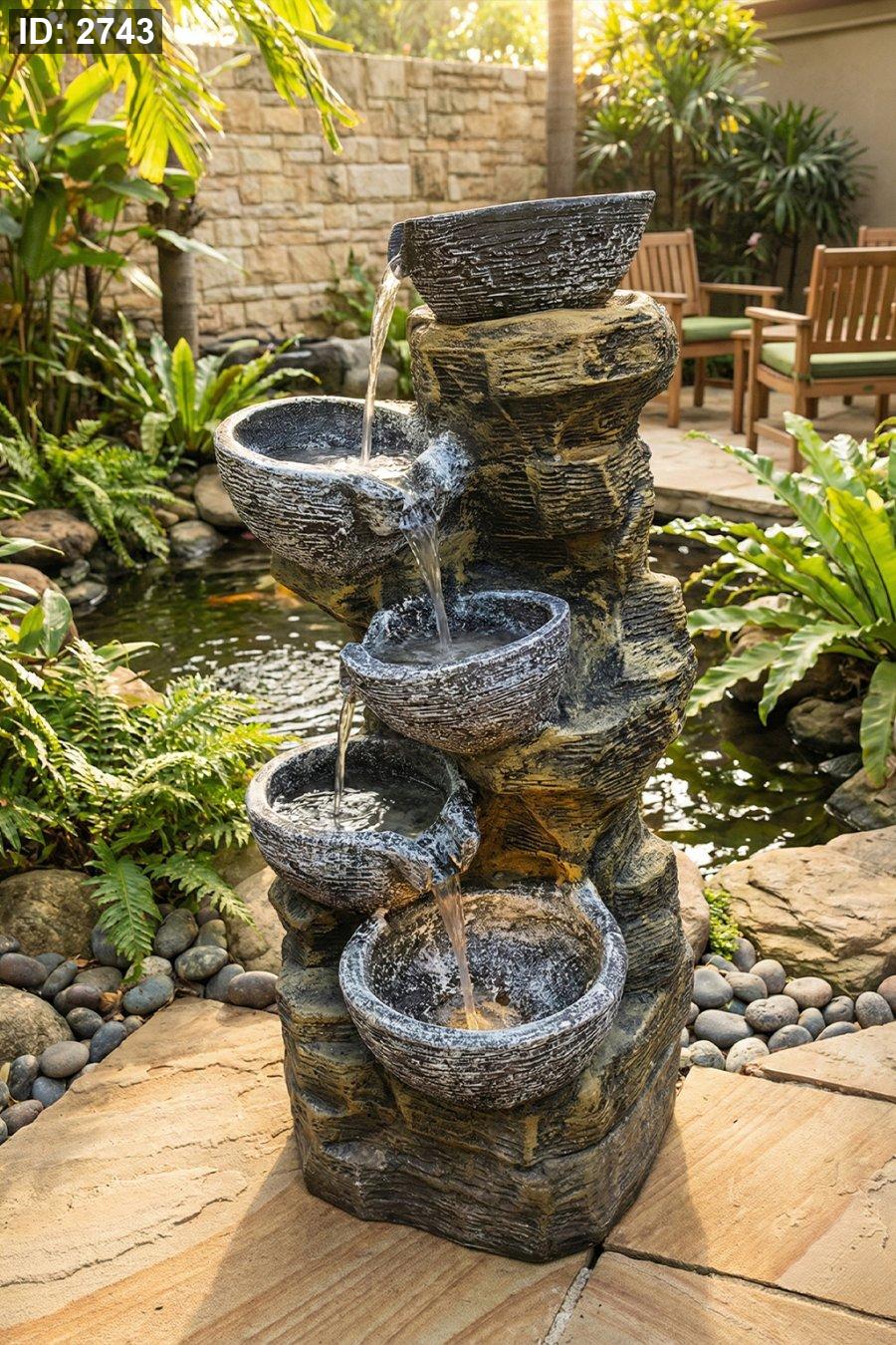 نافورة شلال بشكل صخري مع 4 جاطات نزول متتالي… منظر فخم وصوت مي مريح، بتزبط للحديقة أو زاوية الجلسة.