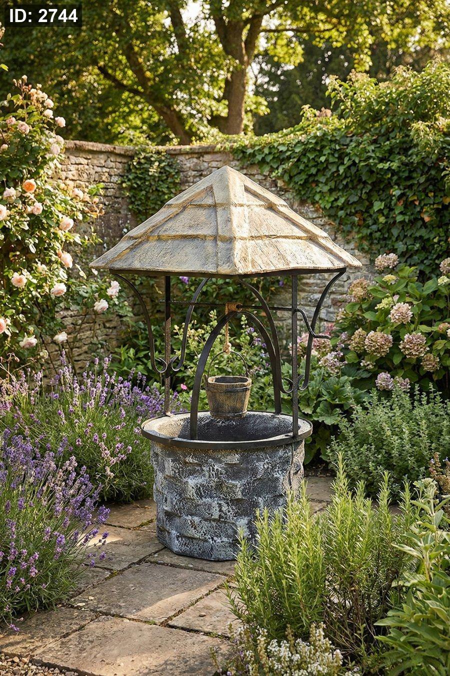 نافورة بشكل بير تراثي مع سقف ودلو معلّق… بتعطي فخامة و”ستايل قديم” لزاوية الحديقة أو المدخل.