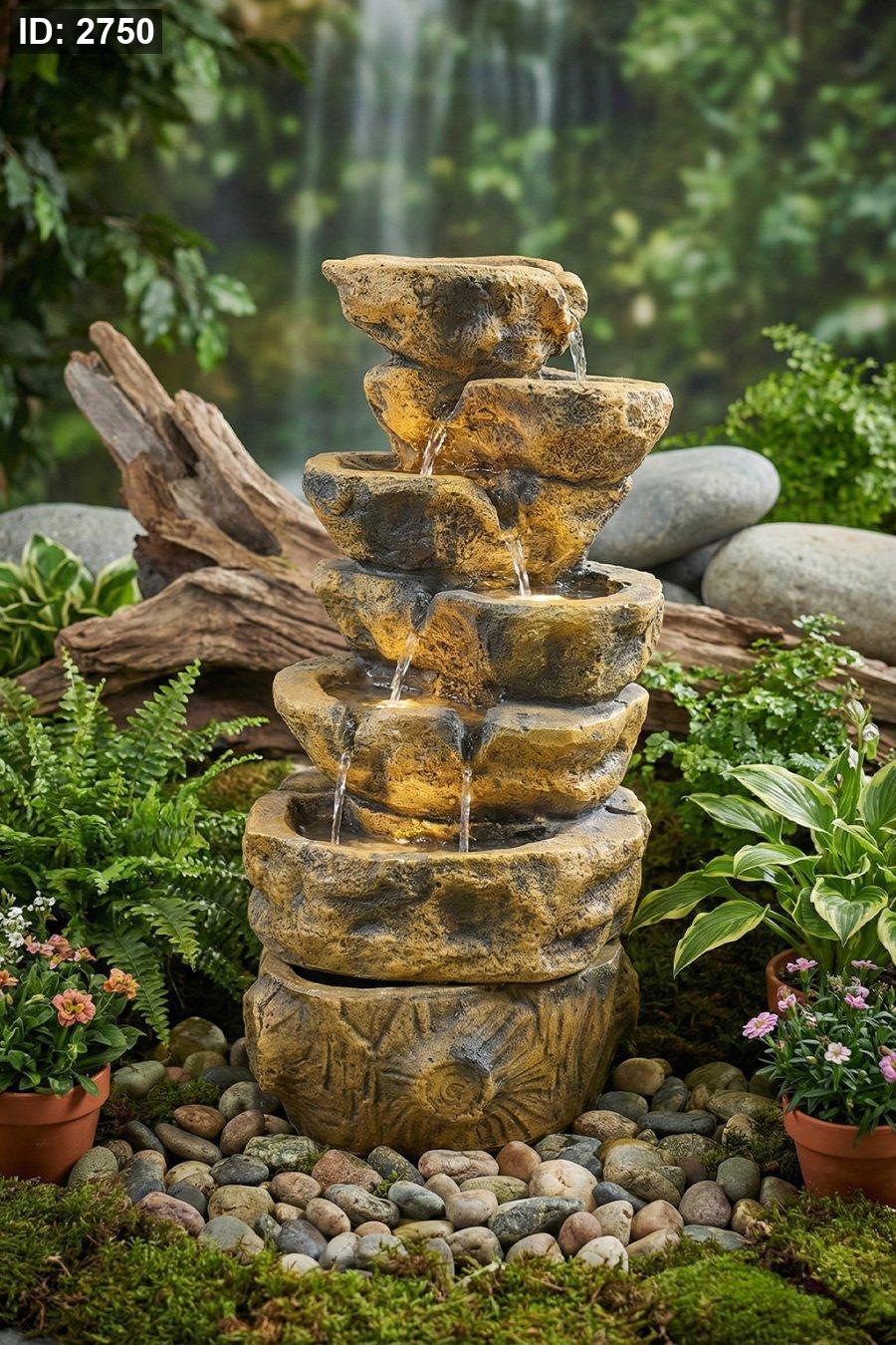 نافورة حجرية على شكل طبقات صخر—ميّ بتنزل على مراحل وصوتها هادي ومرتاح، ممتازة لزاوية الحديقة أو جنب جلسة.