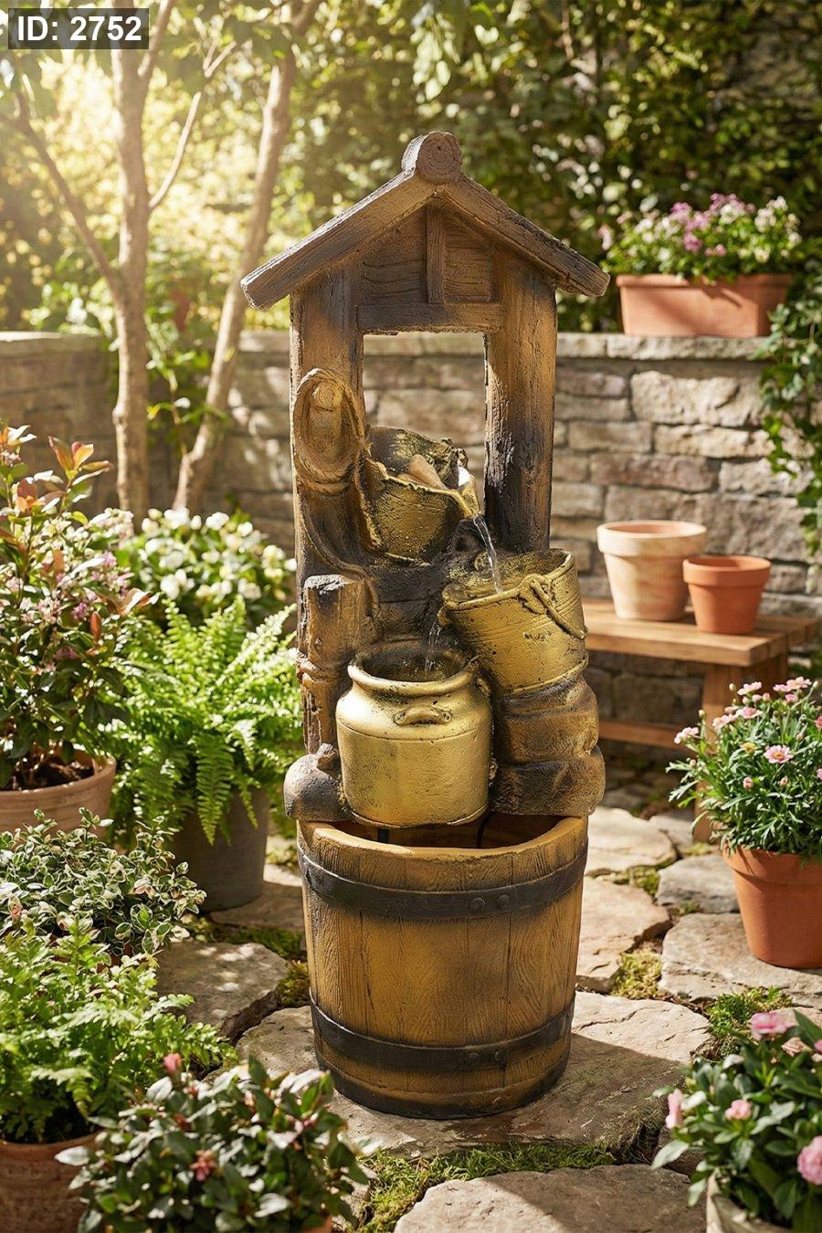 نافورة ديكور ريفي بشكل “بير” مع جرار متدرجة—تعطي لمسة تراثية وصوت ميّ هادي للحديقة أو المدخل.