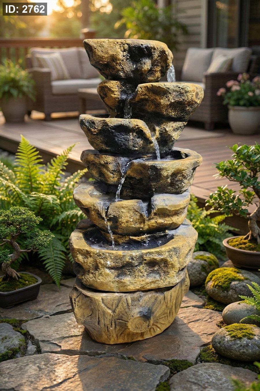 نافورة بشكل صخور طبقات متساقطة بتعطي منظر طبيعي وصوت مي مريح… ممتازة للحدائق والشرفات والزوايا الخارجية.