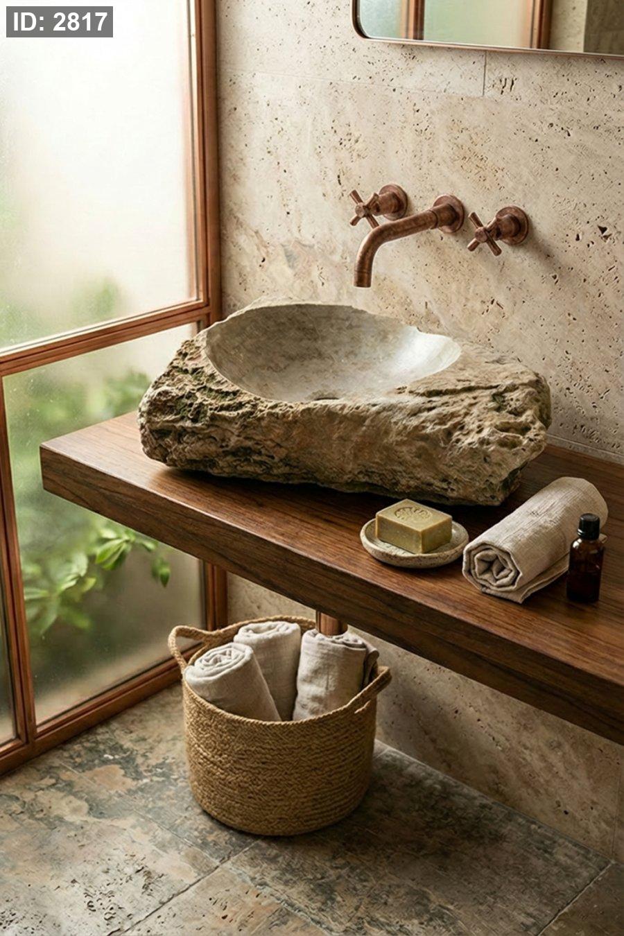 حوض حجري بتصميم طبيعي خام ولمسة مميزة بتبرز جمال الحجر الحقيقي، بضيف فخامة ودفء للحمام، ومناسب للديكورات الراقية والريفية والطبيعية.