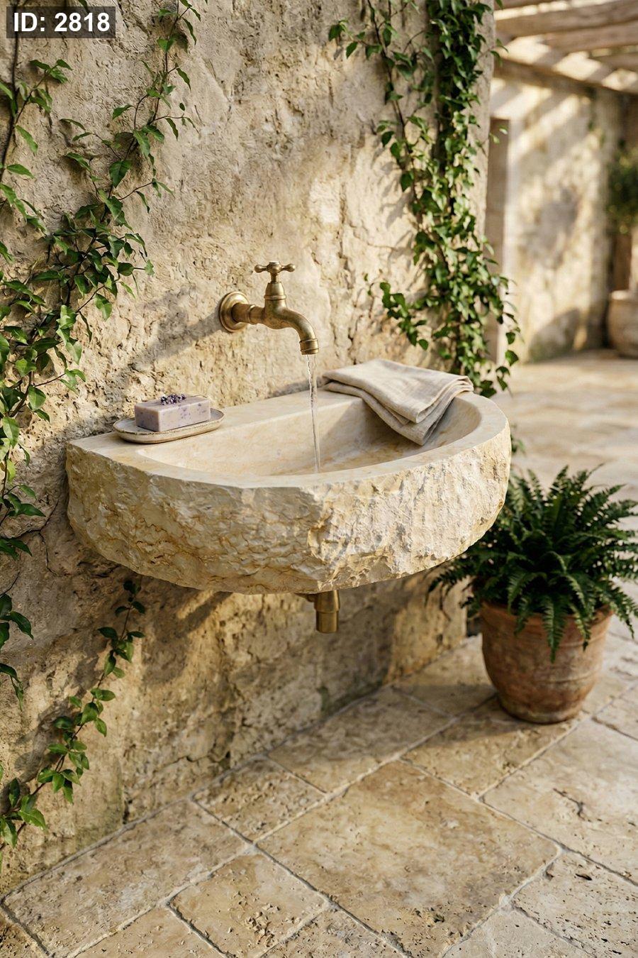 حوض حجري جداري بتصميم أنيق ولمسة طبيعية خام، بضيف فخامة وتميّز للمكان، ومناسب للحمامات الراقية والمساحات اللي فيها طابع ريفي وطبيعي.