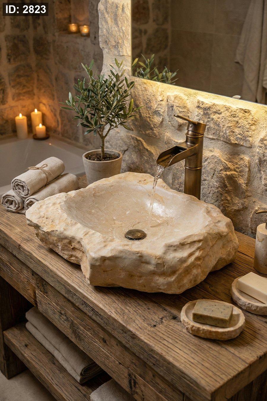 حوض حجري بتصميم طبيعي خام وحضور قوي يبرز جمال الحجر الحقيقي، بضيف لمسة فخمة ودافئة للحمام، ومناسب للديكورات الراقية والريفية والطبيعية.