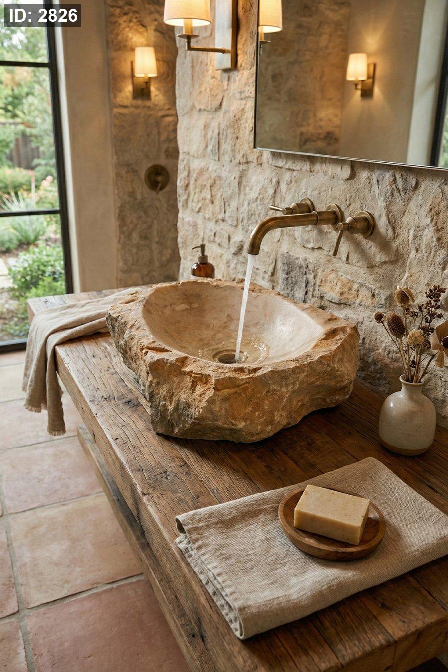 حوض حجري بتصميم طبيعي خام ولمسة فريدة بتبرز جمال الحجر الحقيقي، بضيف فخامة ودفء للحمام، ومناسب للديكورات الراقية والريفية والطبيعية.