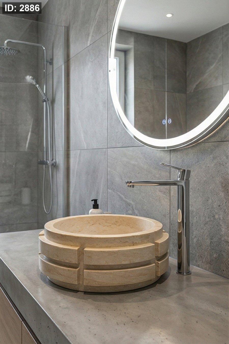 حوض حجري بتصميم دائري مميز وتفاصيل هندسية أنيقة، بضيف لمسة عصرية وفخمة للحمام، وبلائم المساحات الحديثة والديكورات الراقية.