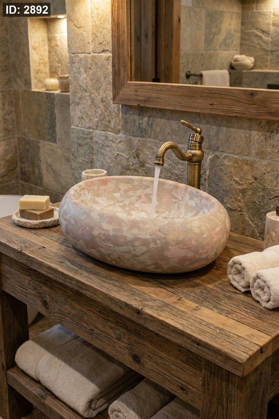حوض حجري بتصميم بيضاوي أنيق ولمسة لونية ناعمة بتعطيه شكل مميز وراقي، مناسب للحمامات الفخمة والديكورات الدافئة اللي فيها طابع ناعم وأصيل.