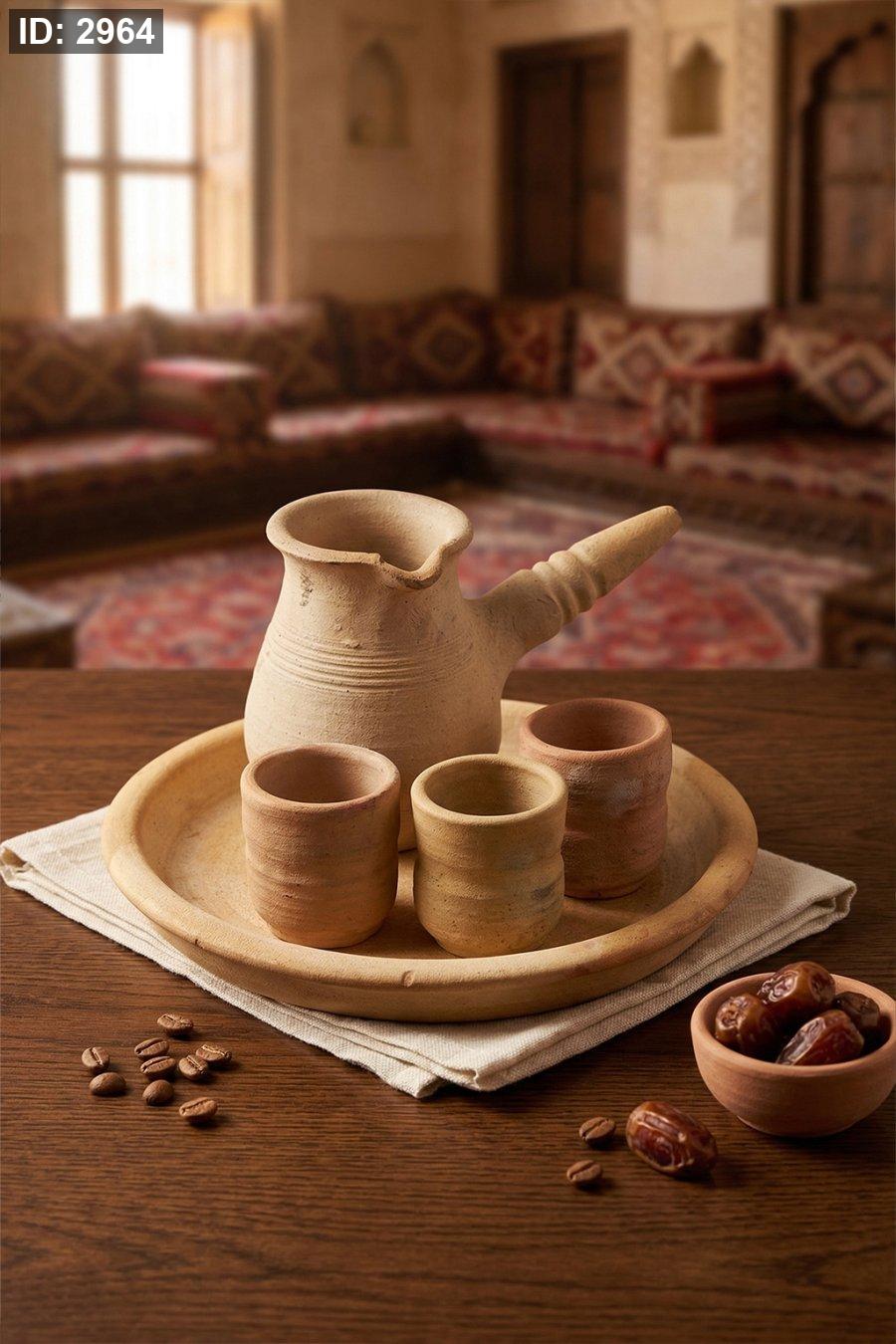 طقم فخار تراثي أنيق يضم دلة قهوة مع 3 كاسات وصينية من الفخار، مناسب لتقديم القهوة العربية بطريقة أصيلة ولمسة ضيافة مميزة.