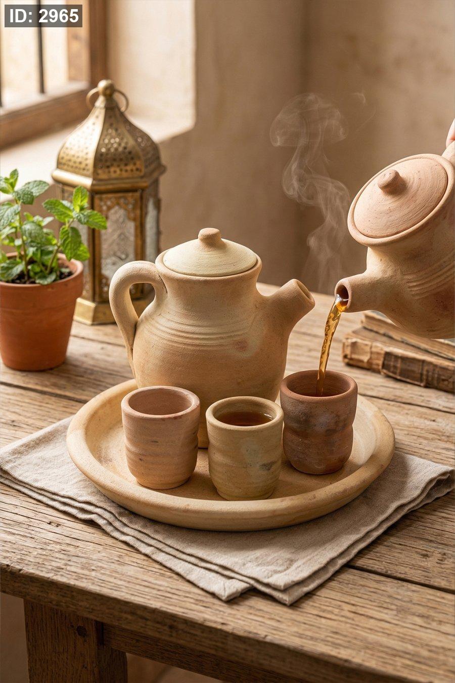 طقم فخار تراثي أنيق يضم دلة شاي سعة 1 لتر مع 3 كاسات وصينية من الفخار، مناسب لجلسات الشاي الأصيلة وبطعم لا يقاوم على الفحم.