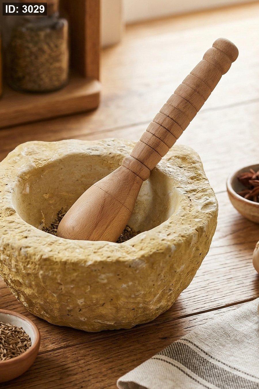 مدقة أنيقة وعملية مصنوعة من خشب الزان الطبيعي، مناسبة لدقّ البهارات والثوم والأعشاب بسهولة، وتمنح مطبخك لمسة تراثية دافئة.