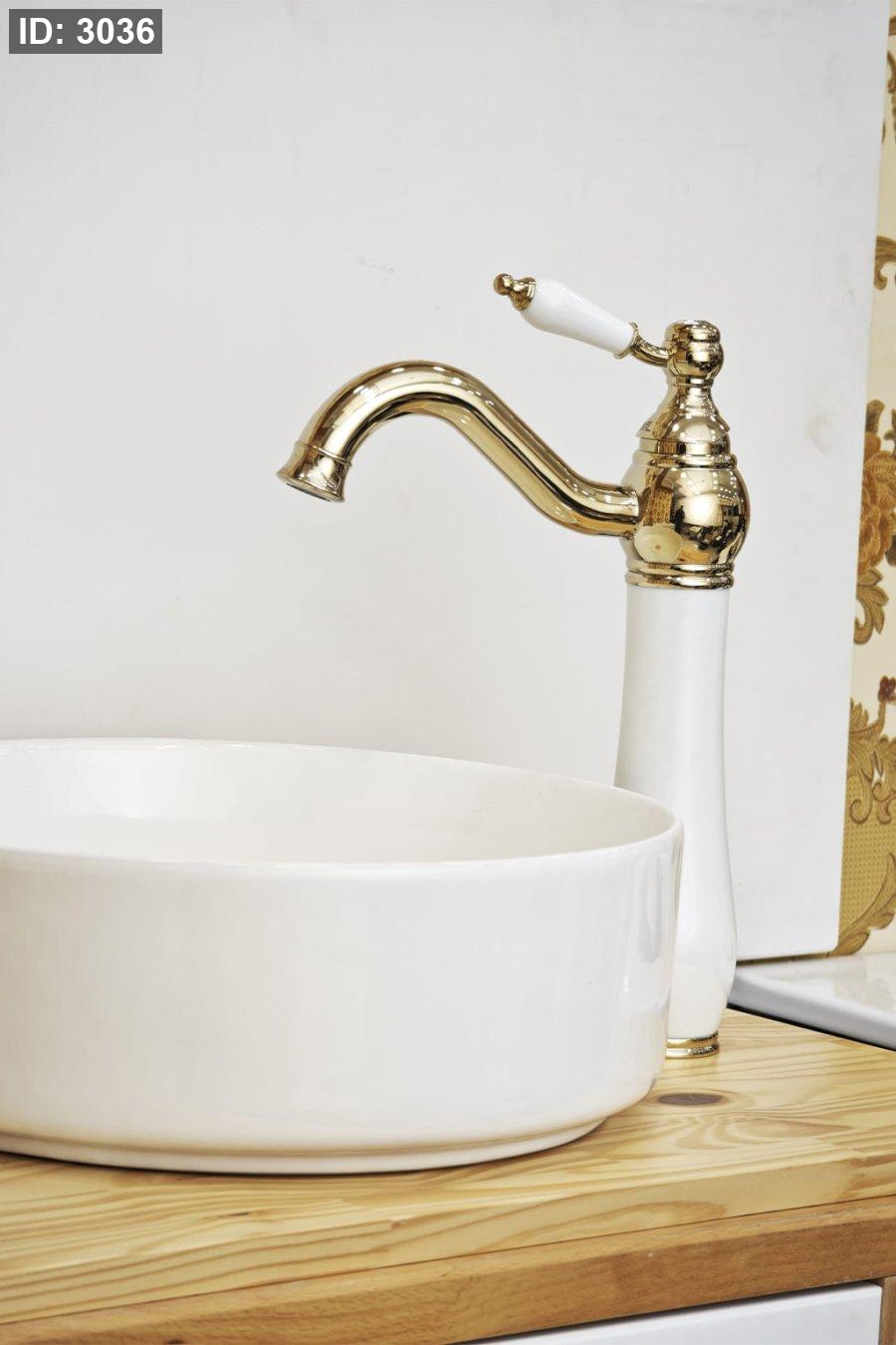 حنفية مغسلة بتصميم كلاسيكي أنيق باللون الأبيض مع تفاصيل ذهبية لامعة، مناسبة للمغاسل الراقية وبتعطي الحمام لمسة فخمة وناعمة. خدمة التوصيل متوفرة لجميع المناطق.