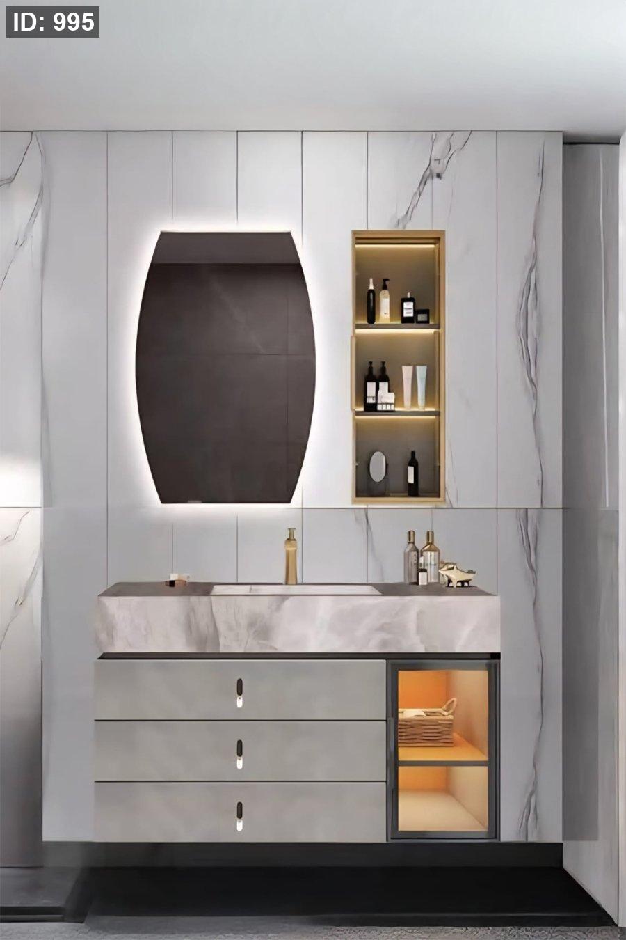 يشمل: خزانة مغسلة معلقة مع نافذة عرض، سطح مع مغسلة مدمجة، مرآة بإضاءة خلفية، وخزانة جانبية (نيش) مضيئة