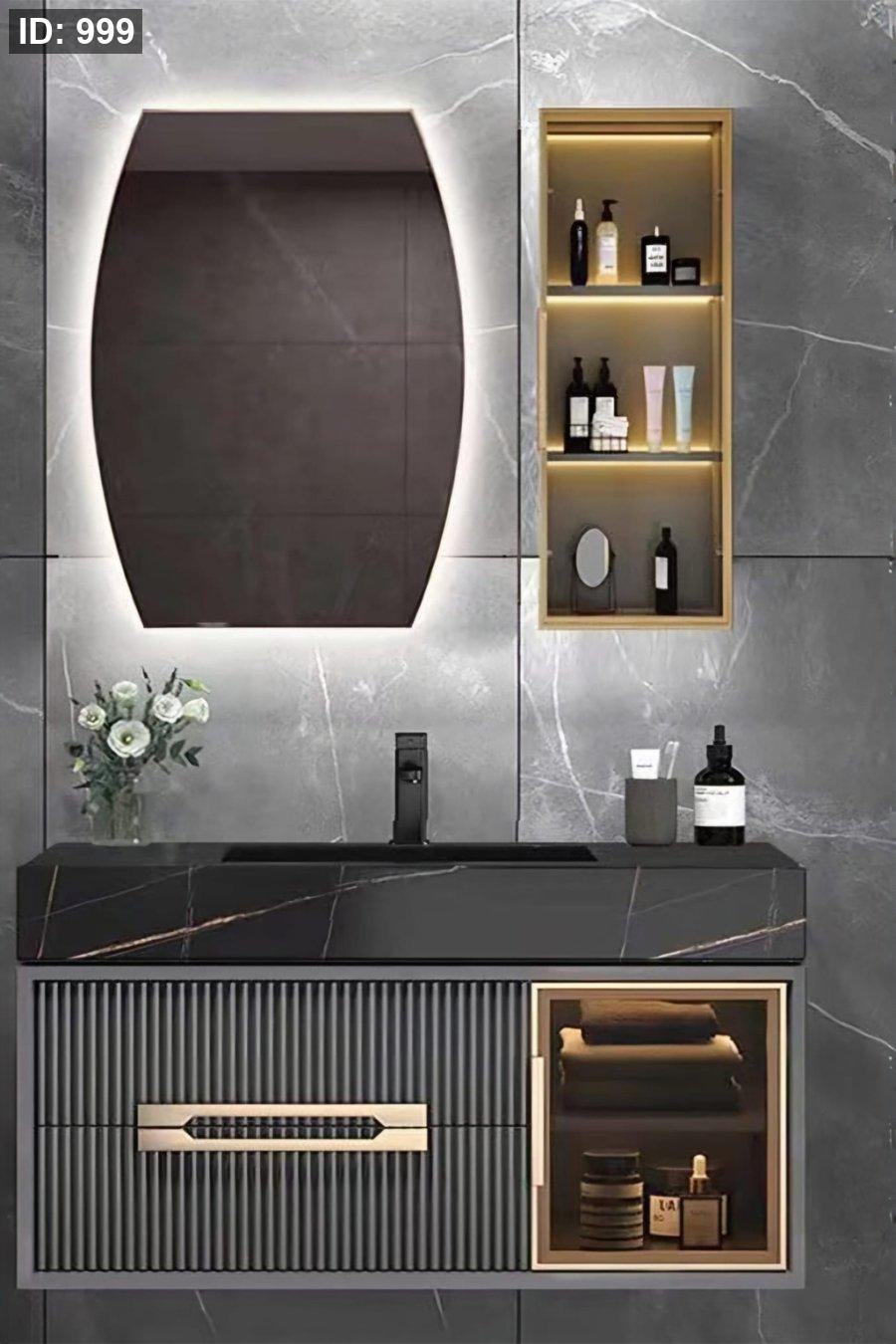 مغسلة بورسلان رخامي مع خزانة معلّقة وتصميم معدني داكن – مع مرآة LED فاخرة